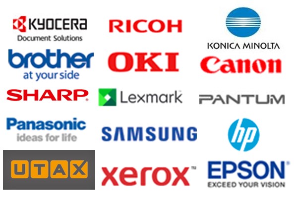 Various printer brands including: Kyocera, Ricoh, Sharp, Konica, Hewlett Packard, Samsung, Oki, Pantum, Canon, Xerox, Lexmark, and Brother